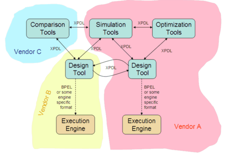 The importance of process design interchange will increase as the market matures. Currently, without design exchange, a single vendor must supply all of the tools that an organization might use. As the market matures, we can expect to find specialized tools that provide one function better than the vendor providing the engine. Or there will be people who are trained on a special tool and don’t want to lose that skill to pick up a new vendor version. The result is that we see a complete ecosystem of specialized tool that all work at the design level. This might be depected as below:
