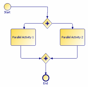 In a certain sense, this is all that an execution engine needsto know. The two invoke activities will be launched in parallel, and the process will not complete until both invoke activities are complete. But if you try to read this back into the process modeler, you will find that you can construct something that looks very much like the original (because the AND gateways can be added in because they are logically required, and the arrows between them are logically required) but you can not guarantee that the diagram will be the same because the graphical information is simply not there in the file. Note that BPEL has no way to directly represent a line in the diagram, and it does not need to, since lines are not executed, they simply show the relationships of things.