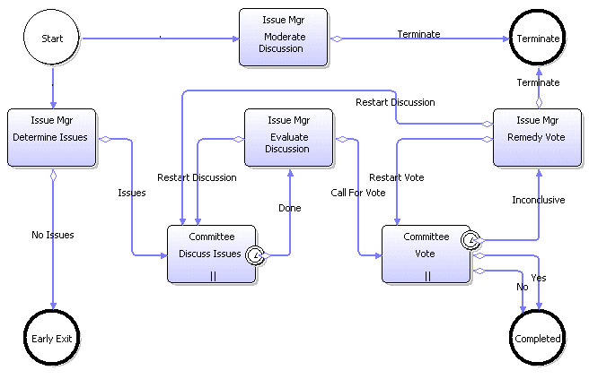 The main process is the lower 5 activites. First the issue manager decides the issues to be discussed. Second, the issues are discussed by the committee. Then the issue manager decides if the issues have been discussed enough and completes that by either “Restart Discussion” or “Call for Vote”. If it is the latter, the committee is asked to vote. If the vote is not conclusive, then issue manager must Remedy Vote and where he will be able to reduce the number of voters or the number of resolutions to vote on, and to choose either to Terminate the process, go back to Discussion, or go back to Vote.