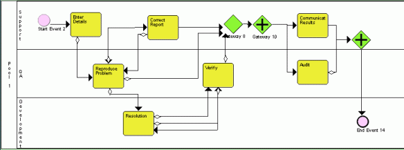 I started by designing a copy of the OMG Trouble Ticket scenario (see examples). The result was a respectable diagram as shown below which includes swim lanes and all the standard BPMN elements: