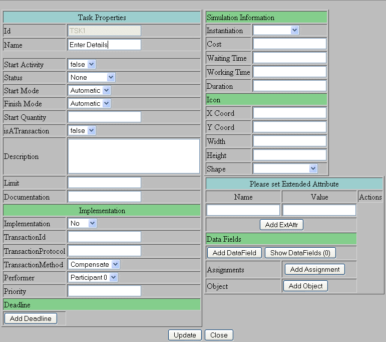 This seems very complete. Notice expecially the “simulation” information which can be set up to include cost, waiting time and duration. Extended attributes can be added and edited. Deadline is supported, as well as icon position and size.