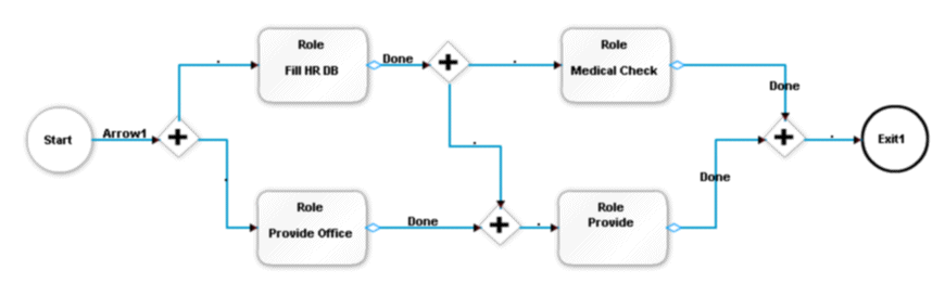 Completing the “Fill HR DB” sent an event to the “Medical Check” activity to activate it, as well as to the AND node, satisfying that, and causing “Provide Computer” to be activated as well.  So we have two activities active at this time.  Again, these are in parallel, and so they could be completed in either order, so lets choose to complete the “Medical Check” workitem.