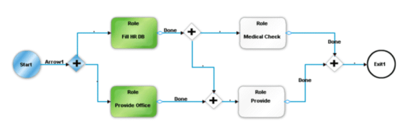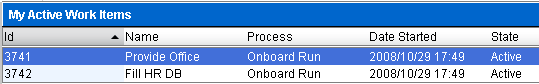 The the “Fill HR DB” has not been completed, and so that task is still on the list. The Provide Computer step can not be started before the Fill HR DB step is completed, because the AND node requires input from both direction.  There is only one active activity (indicated with green) and so we have one workitem.  The AND node is colored green here to show that it has received one, but not both inputs.  We complete the “Fill HR DB” workitem: