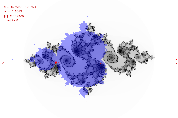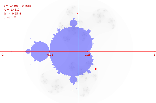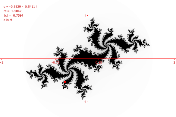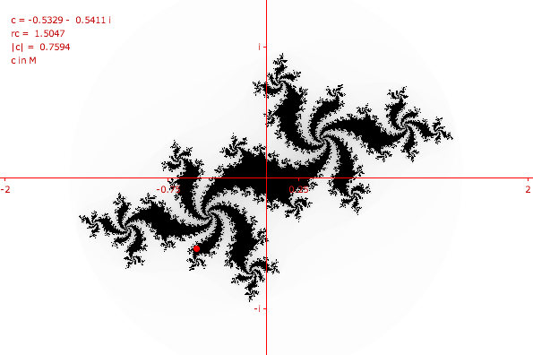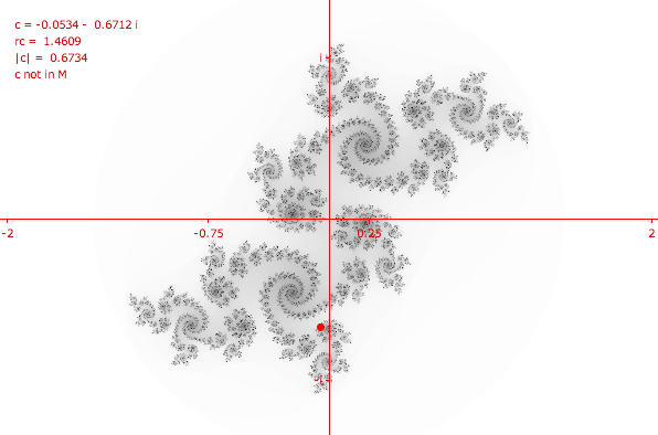 As you move the red spot, it constantly generates. It is nothing short of fascinating to see how the Julia Set depends upon the position in or out of the Mandelbrot set.  If you move the spot well outside the Mandelbrot set, the Julia set gets thinner and less substantial, in the case below it appears as gray whisps: