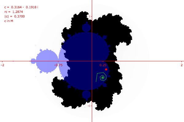 The blue guide disappears when you release the spot.  Then there is another interesting feature.  If you click on any spot within the Julia Set, it will plot the calculations for that point as a green line.  Each point is determined to be in or out of the set, based on whether an iterative calculation converges to a finite point or not.  The green line shows the trace of points that the iterative calculation makes.  It only shows traces that actually do converge (that is, only points that are IN the Julia Set).