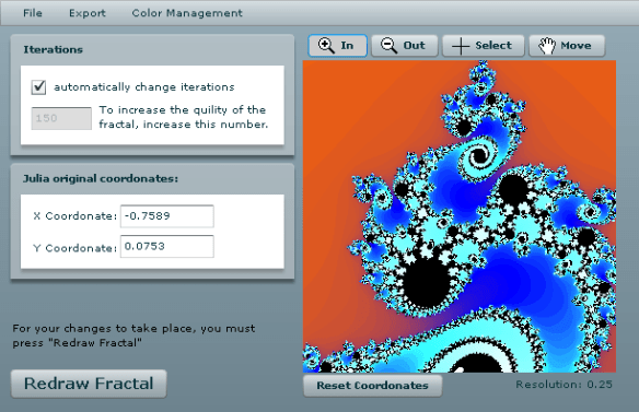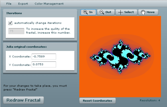 Again I entered the constant that defined the Julia set I wanted (-0.7589 and 0.0753) and you get a low rez image on screen.  There is substantial power in being able to color the escape set (but curiously I never found a way to color the interior set).  Like many freeware tools the user interface is idiosyncratic and hard to use at times, but play with it for a while, and the results are stunning.