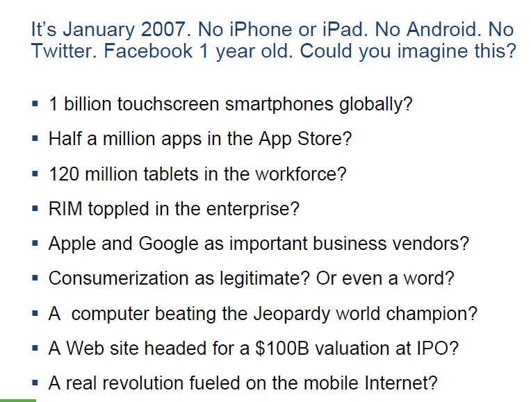 He presented a slide showing how dramatically the world has changed since 2007, only 5 years ago. At that time there was no iPhone, no iPad, no app store. The smart phone era has grown from essentially zero to 1 billion devices in 5 years! 700 million people participate in social networks.