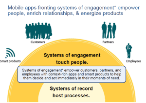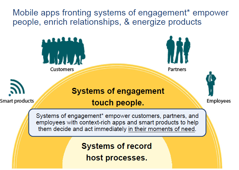 Architecture start with the systems of record in the middle, building out from that. They don’t host processes, but instead serve people. That is where the benefit is, and where the loyalty lies. Empowers with context rich apps. Instead of accessing a web form and entering a bunch of information in order to get stuff, users will simply open phone and it will already know what it needs to know to get you want you want. That is what is different about this new mobile centric approach.
