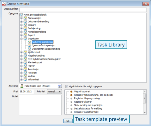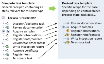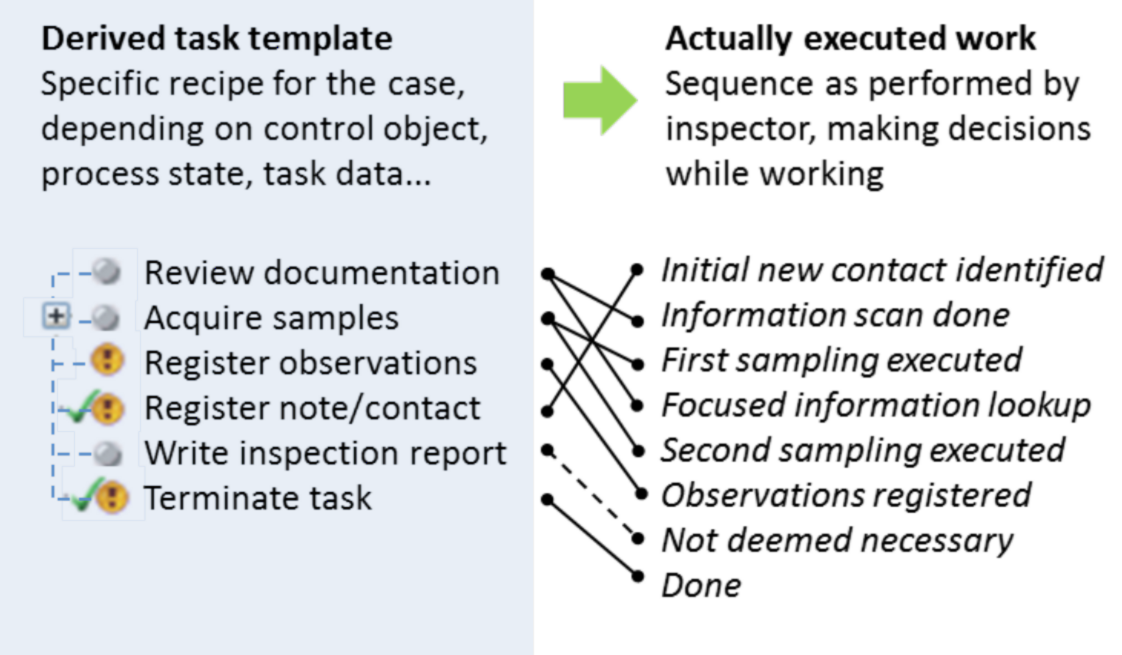 Because they are prepared for emergencies, naturally there are templates with lists of such tasks as might normally be needed, but the key is that the knowledge workers (the food safety expert) can pick and choose from those tasks in the template. Here is a graphic from Helle’s presentation depicting how some tasks might be taken: