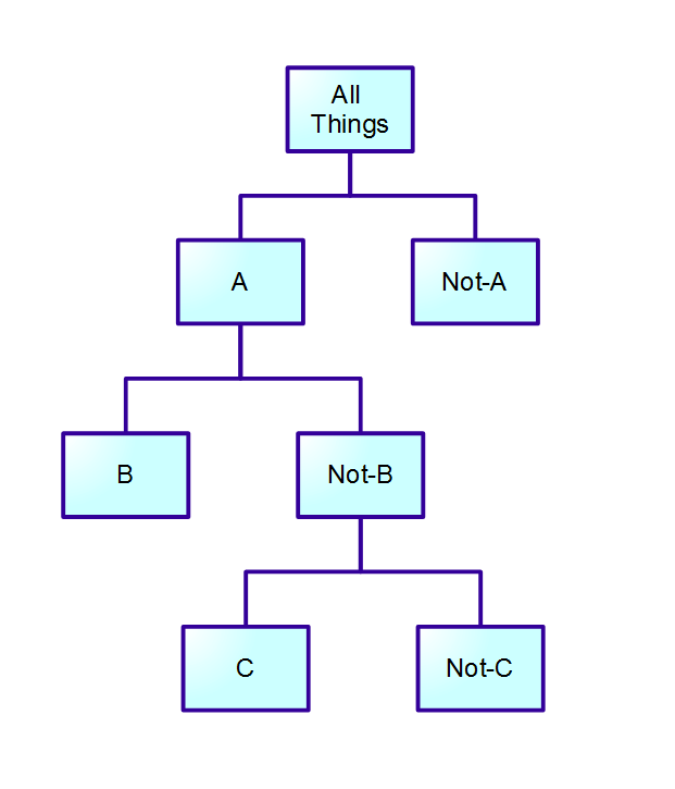 What this says, quite simply, is that you can pick a quality such as “A” and divide all things into those that have the quality A, and those that do not. It is impossible for something to both have and not have the quality A. Then, of those things with A, you can pick another quality and divide again. We all know this from the game “20 questions” where you attempt to identify something based on a series of yes/no questions. Is it an animal? Does it have 4 legs? Can it fly? And so on.