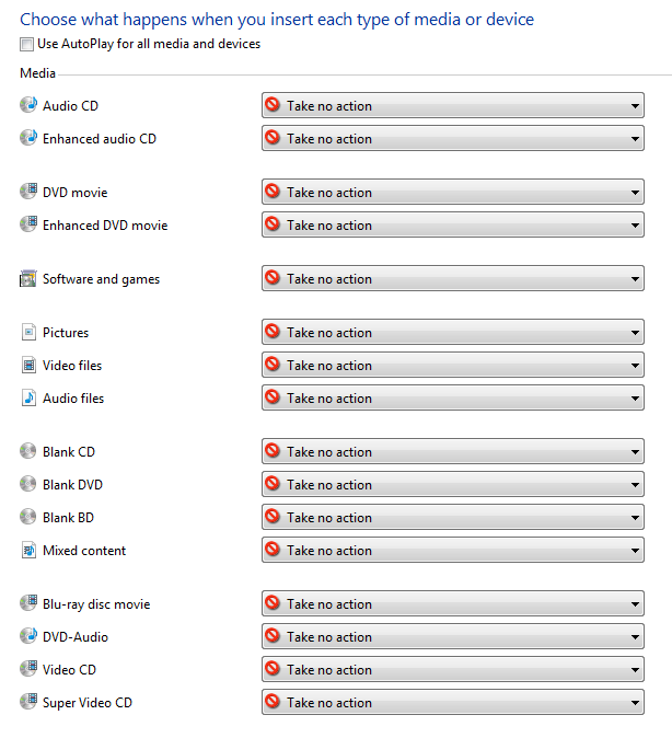 You really don’t want the computer automatically running anything when you put media in. It is an infection waiting to happen. Someone says: “Here, my slides are on this thumb drive” and the next thing you know there is a virus on your computer. Instead, if I really want to run something, I double click on the file. How many times do I need to do this? About once a year. The danger of automatically running something you didn’t want run is far greater than the convenience of eliminating the double click when I do want to run something.