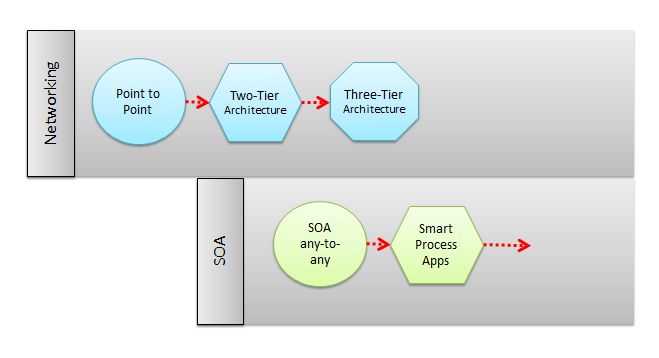 I have found this depiction to one that helps people understand where smart process apps fit in relation to everything. We are beginning to see stratification in the SOA environment. It is a natural course for technology maturity. Another depiction below showing the emergence of these patterns over time: