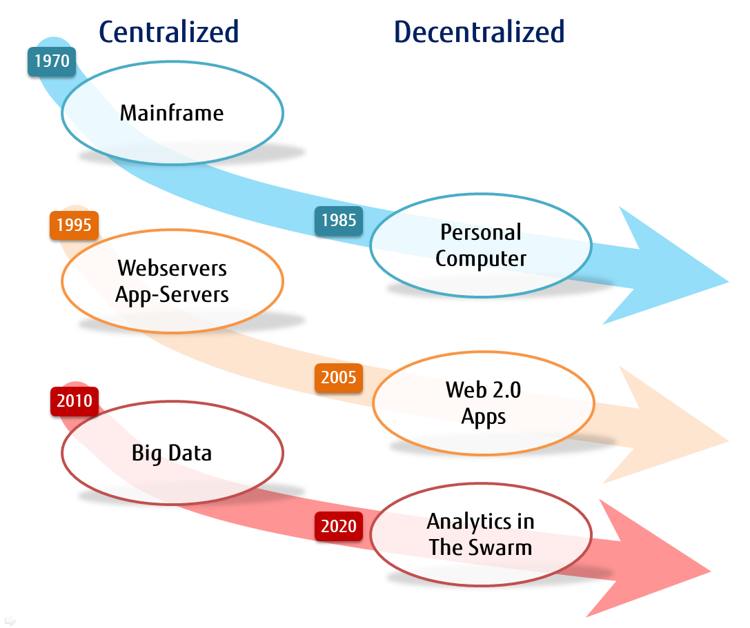 Big data is a style of data analysis that reflects a return to large, centralized data repositories. Processing power and memory are getting cheaper, while the bandwidth among all the smart devices remains a barrier to getting all the data together in one place for analysis. The trend is for putting the anaytics into the swarm of devices known as the Internet of Things (IoT)