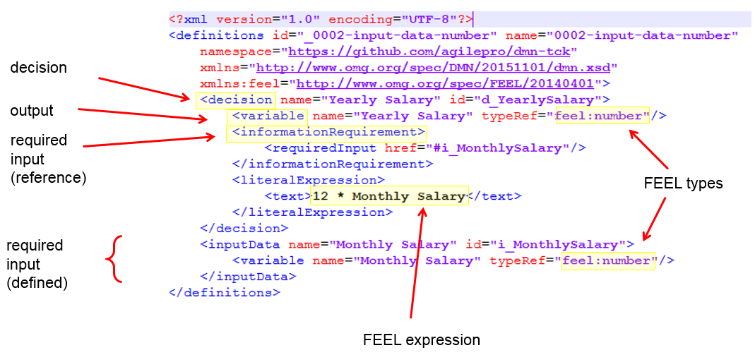 This decision simply calculates the yearly amount by multiplying the monthly amount by 12. This tests the ability for an engine to parse that FEEL expression, and correctly evaluate it. And here is the XML test file:
