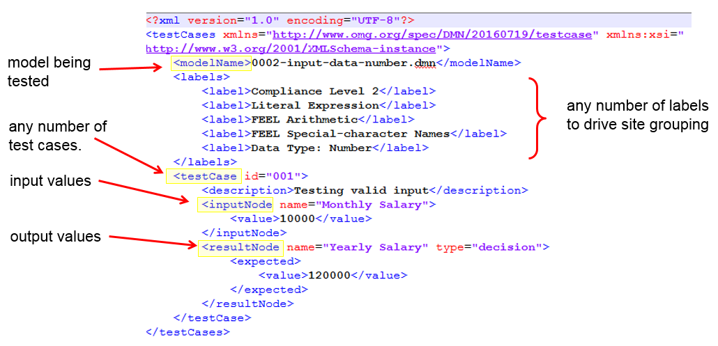 After the first couple of months we abandoned the idea of creating a reference implementation, and pivoted successfully to the idea of providing a framework for publishing test cases which any successful implementation could use to verify and validate their execution. The tests would be files constructed in XML: the DMN model in the standard format, and the test data in another XML which we designed containing input values to submit to the decision model, and output values to compare the output to. To use the tests one needs to write a small “runner” which is code that reads the files, and runs the test.