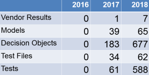 Once the basic pieces were in place, we started collecting tests. The first few tests were models that Bruce Silver had developed for his book DMN Method and Style. The next set of tests came from Red Hat during the testing and finalization of their FEEL evaluator. Camunda added a number of tests. In July of 2017 Actico entered the group, and converted hundreds of their internal tests into the standard form that could be used by everyone bringing the total number of tests to 588.
