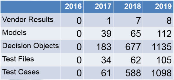 This is important because on the DM Community site there are 19 vendors claiming to support DMN. However, only 3 of them have results currently on the TCK site. There are three more that have had results in the past, but are still making the transition to DMN 1.2. OF the 13 remaining, some are design-time only and never actually execute the tests, and so would not have results in any case, however that still leaves a number of vendors claiming to execute DMN but no having results posted.