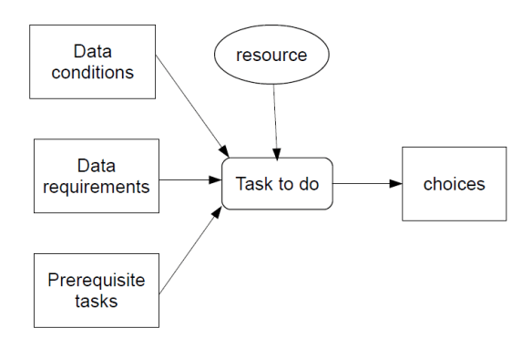 I like the diagram (i.e data conditions, data requirements . . /resources -> task to do -> choices).