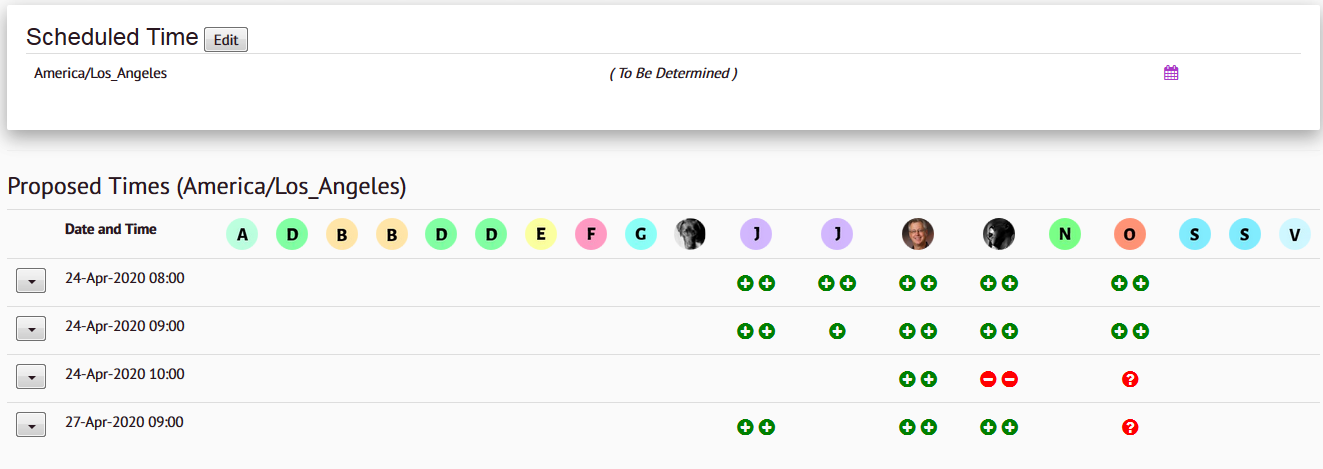 The chart also shows me that the first two proposed times are better than the last two.  I will probably wait another day, and then call the meeting for one of the first two slots using the pull down menu on the left.  After that, people can still enter values, but those really only help indicate whether you will be able to attend the meeting as set or not.