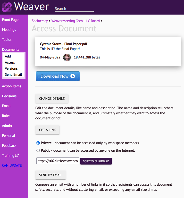 The advantage is you are only sending a link, so that it is not big and does not occupy bandwidth. But when the link is accessed, only then is it downloaded. You can update the document into Weaver, and the recipient only gets the latest version of the document. The document remains in the repository so that everyone can access it in the future, and they always get the latest version. Everyone can update back to Weaver so that you don’t have divergent paths. You rarely need it, but when you do, you can access all the old versions of the document.