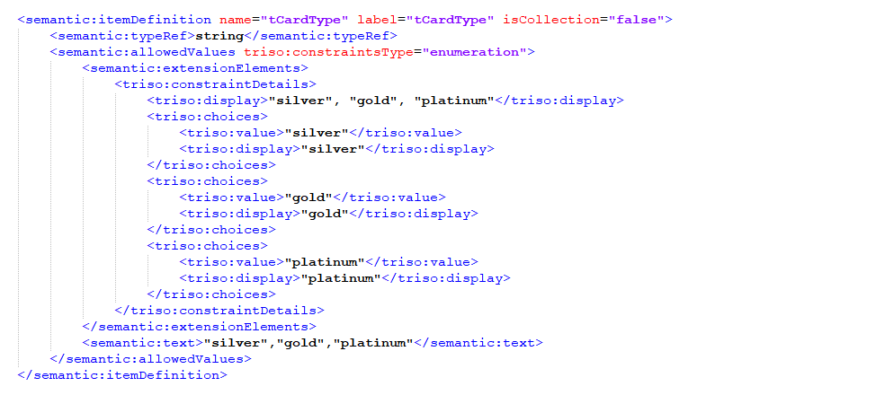 Trisotech output the following XML for the enumeration. Note that the tags that start with “triso” are Trisotech specific tags. Notice that the values are defined as separate tags, and that there is a display value separate from the underlying data value: