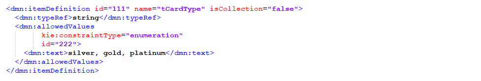 KIE Sandbox produced the following XML for the enumerated type. Here the tags that start with “kie” are custom tags. Here there is a single tag containing the values as a quoted, comma delimited list. I also tried creating values with quotes and commas, and I was successful in doing that.