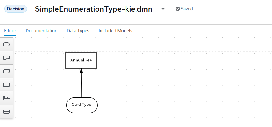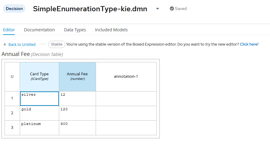 - Trisotech (DMN 1.1) to KIE Sandbox: Data type was received correctly. Trisotech exports four different versions, version 1.1, 1.2, 1.3, and 1.4 of DMN. Version 1.1 imported correctly. I also tried version 1.4 but it failed for a reason unrelated to the enumeration type. KIE Sandbox does not support this version yet, so something like this is not surprising.