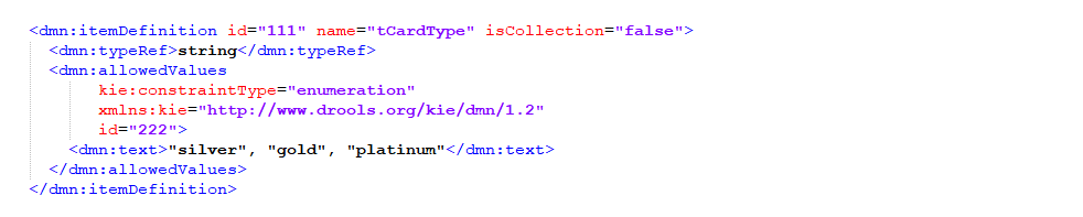 KIE Sandbox produced the following XML for the enumerated type. Here the tags that start with “kie” are custom tags. Here there is a single tag containing the values as a quoted, comma delimited list. I also tried creating values with quotes and commas, and I was successful in doing that.